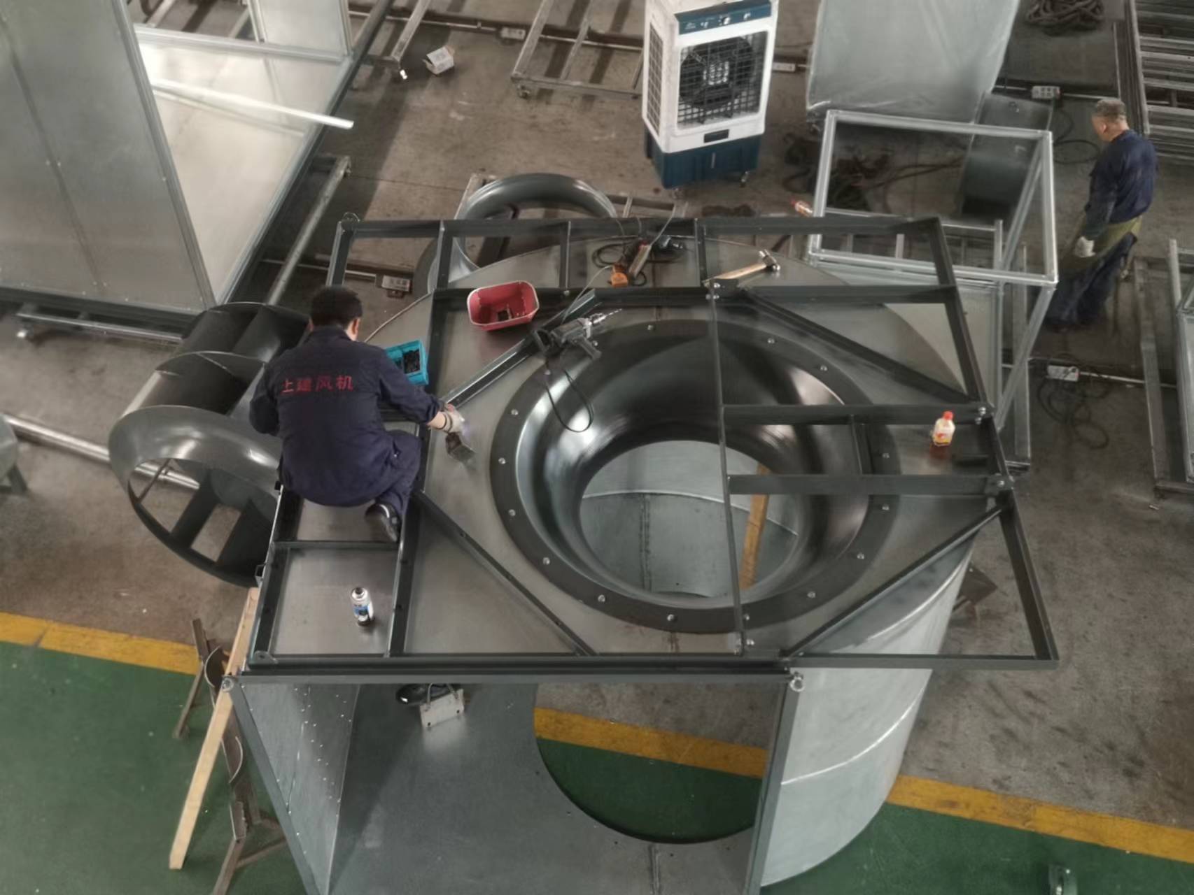 HTFC-V-16是公司成立以来最大的箱体风机。为了保质保量的按时完成HTFC-V-16,车间上下全体成员积极响应公司号召,发扬不怕苦、不怕累的精神,以高昂的斗志迎接新挑战。尤其是我们箱体车间的兄弟们。因为他们不仅需要担当自己生产任务,而且还要完成研发组装新型HTFC-V-16全部任务。
